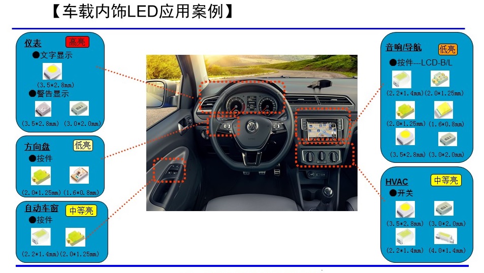 配合汽車內室燈光的需要,提供全色系、全尺寸的LED解決方案,應用于影音娛樂終端、空調控制器、儀表顯示、各類功能型按鍵開關、情景氛圍燈等